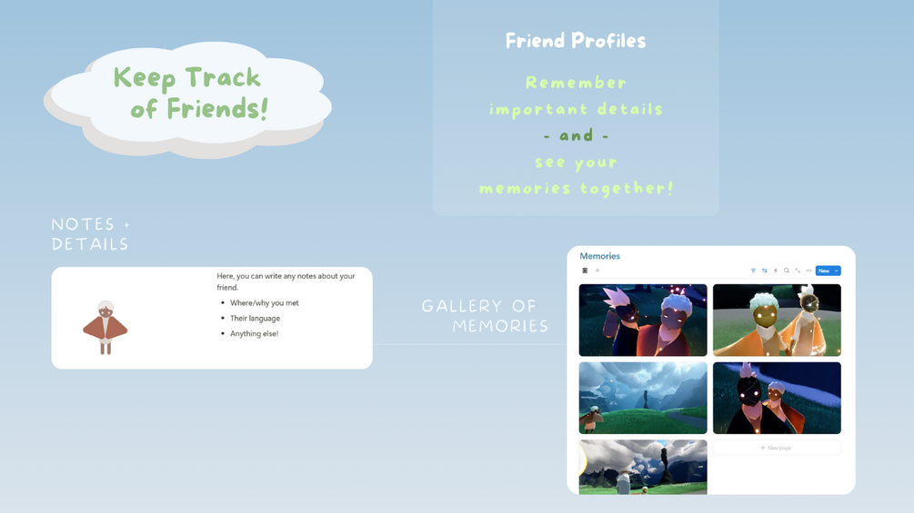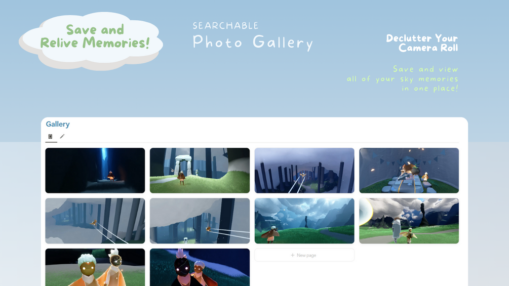 Photo Gallery! Need somewhere to save your awesome screenshots? Don’t let all your memories of playing sky with your friends rot in your camera roll— the Photo Gallery in this template gives them a home where they can be admired, as well as stored and redownloaded later for sharing. You can also sort these pictures by which friends are with you, so you can choose which memories to relive.