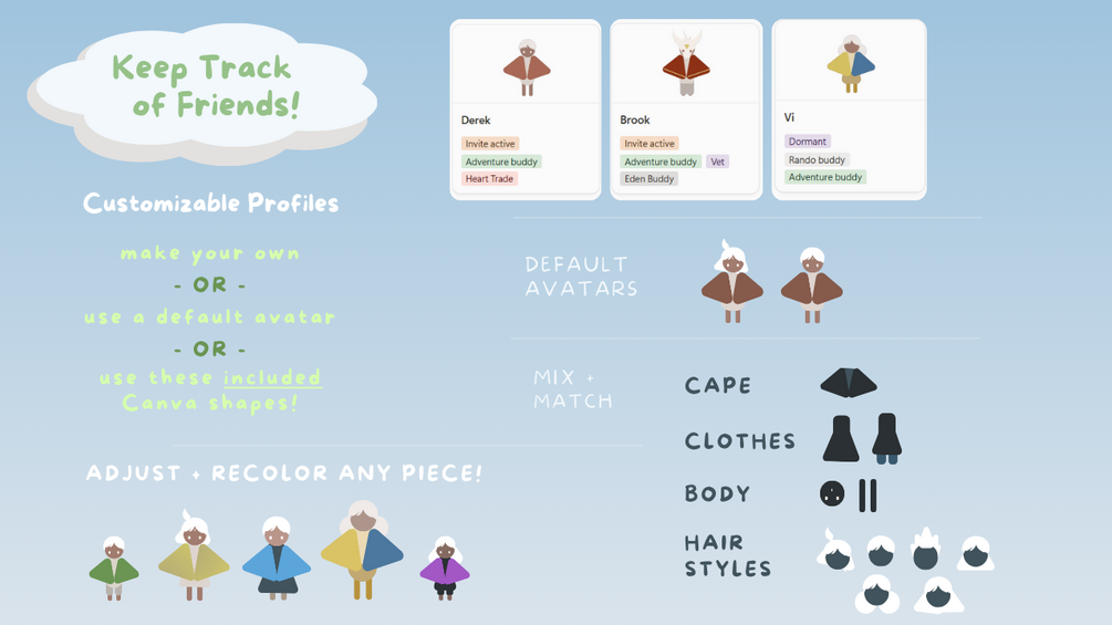 • Need a way to keep track of your rando friends? “Which one did I meet at the sick hot tub in valley of triumph again? Was it Peanuts or Steve?” That’s a question you’ll never ask yourself again! This template reserves a place to record and keep track of anything you want to remember about your friends in Sky. Even the ones you’ve deleted from your game! This gives you the freedom to name your rando friends stupid names like “Boogly,” without forgetting who they are and what they mean to you. (And, importantly, you can track whether or not you can count on them to send you heart gifts back!)
